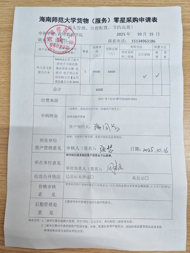 教师教育学院降同昌老师因工作需要,申请采购科大讯飞智能办公本,现公示如下: