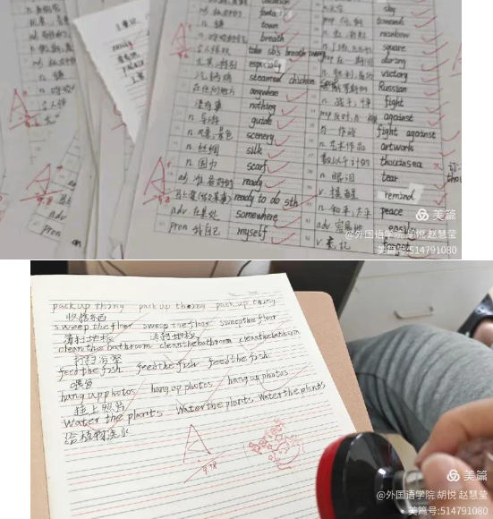 单词是英语学习的基石。我们设计了“新人教八上Unit1默写练习”,从“ancient”“camp”等词汇到“takesb'sbreathaway”等短语,逐个把关。看着学生们的默写本上,红勾与“A”评级不断出现,甚至还有老师用“Perfect”印章给予鼓励,那些反复打磨的“packupthings”“sweepthefloor”等实用表达,也在一次次练习中成为学生们的“语言武器。”