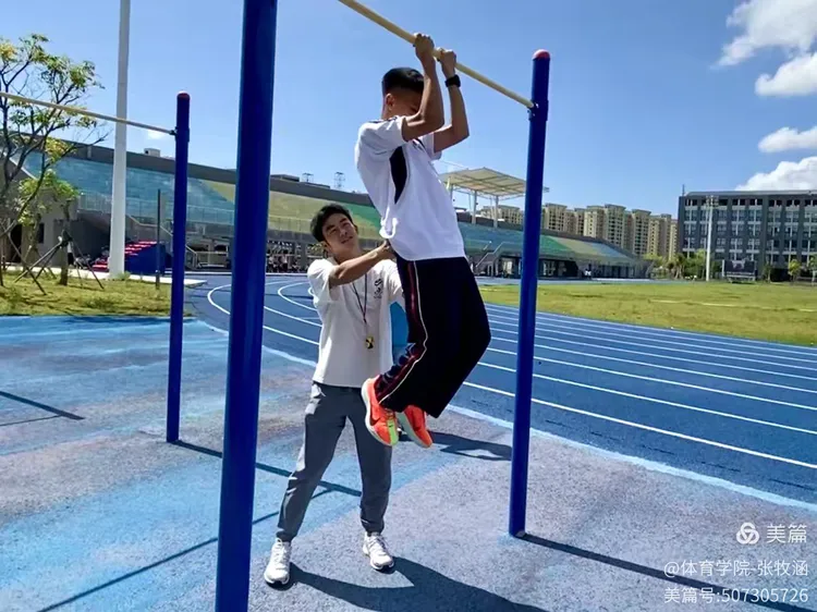图:张牧涵老师对学生引体向上动作进行规范和指导