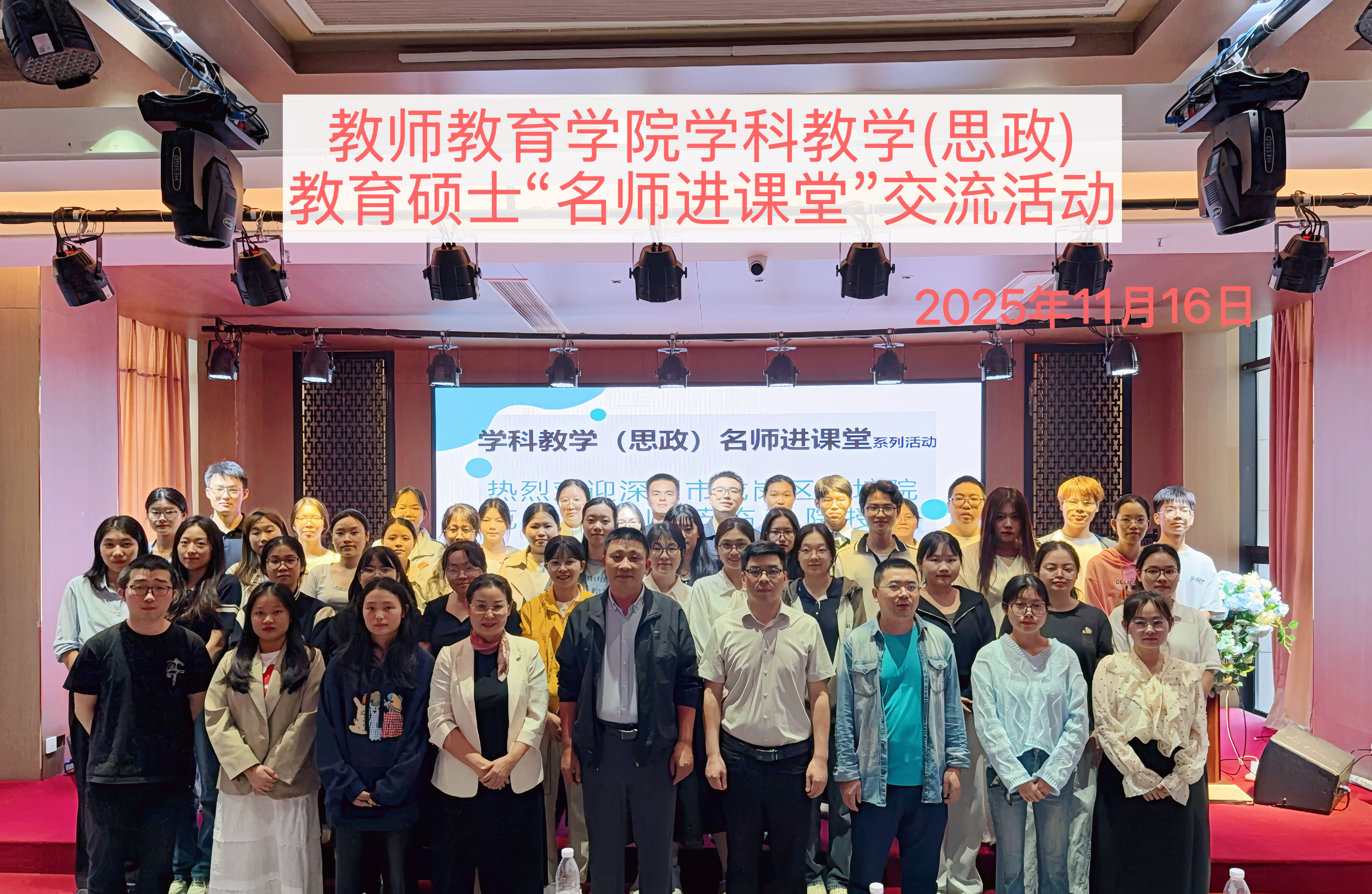 2025年11月16日上午,我院2025级学科教学(思政)硕士于天艺东环大酒店二楼会议厅开展了“名师进课堂”活动。本次活动由教师教育学院陈连珠教授主持,特邀深圳市基础教育“名师工程”名教师、龙岗区教科院初中道德与法治教研员、中学政治高级教师范竹发老师进行分享交流。