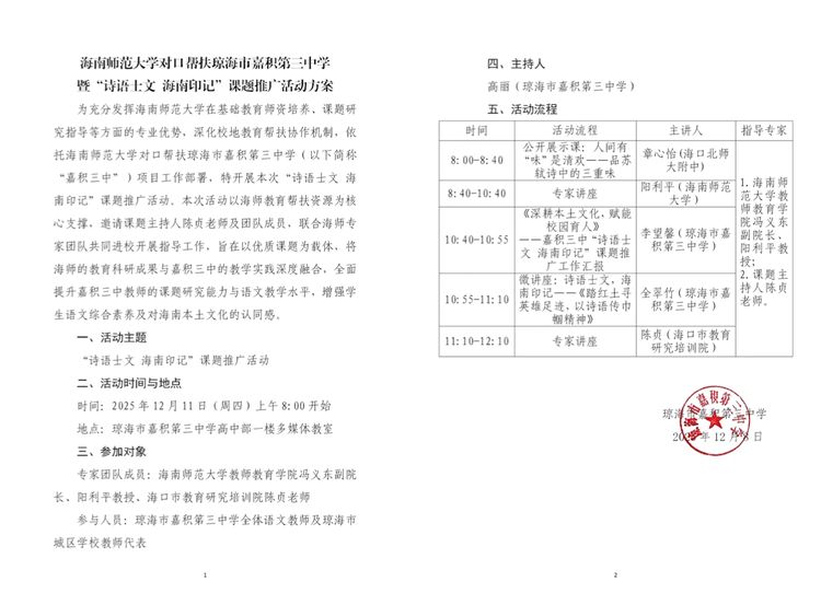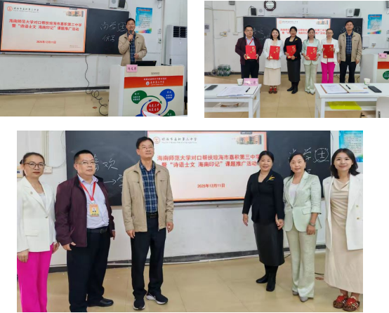 海韵轻梳琼岛冬,文脉流芳绘锦程。2025年12月11日上午,一场以“诗语士文 海南印记”为主题的课题推广与联盟教研共建活动在琼海市嘉积第三中学高中部一楼多媒体教室举行。此次活动由海南师范大学教师教育学院发起,旨在充分发挥其在基础教育师资培养和课题研究指导方面的专业优势,进一步深化校地之间的教育帮扶合作。