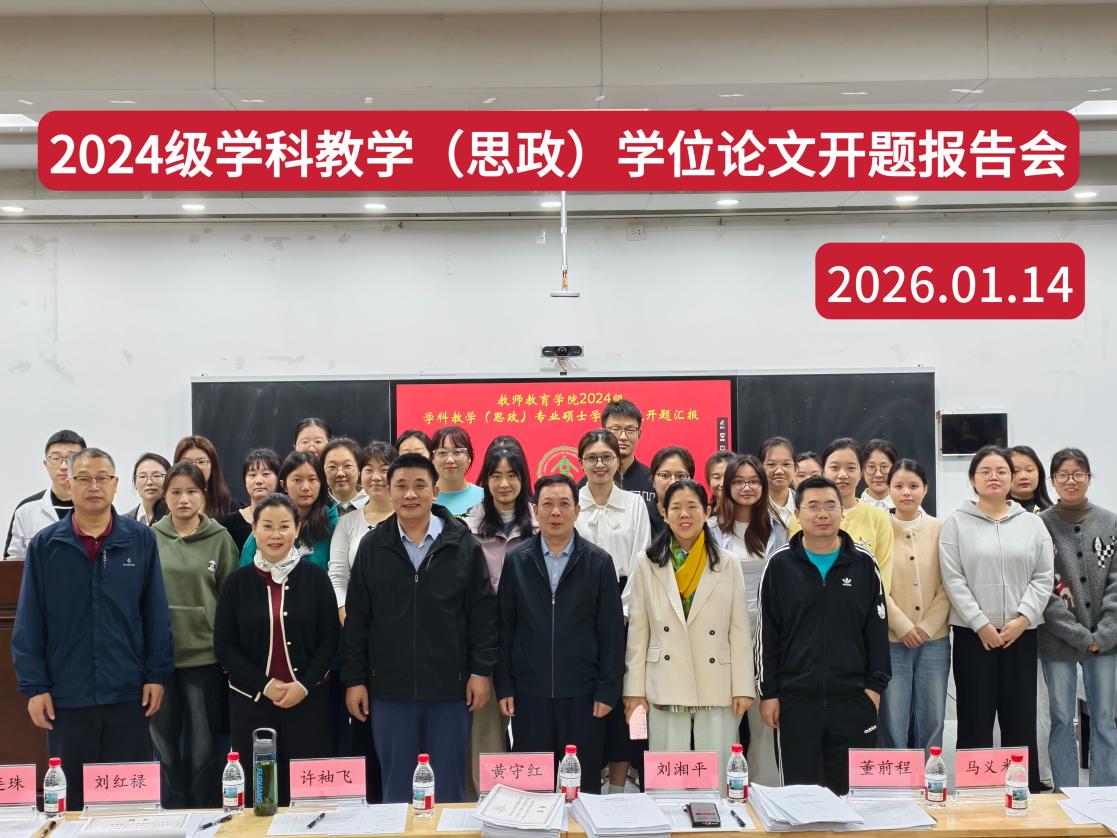 2026年1月14日,海南师范大学教师教育学院2024级学科教学(思政)专业硕士学位论文开题报告会于文科楼101教室举行。参加本次开题报告会的评审专家小组由陈连珠教授、三亚学院黄守红教授、董前程副教授、刘湘平副教授、马义米副教授、许袖飞副教授、海南农垦中学正高级教师刘红禄老师七位专家教授组成。